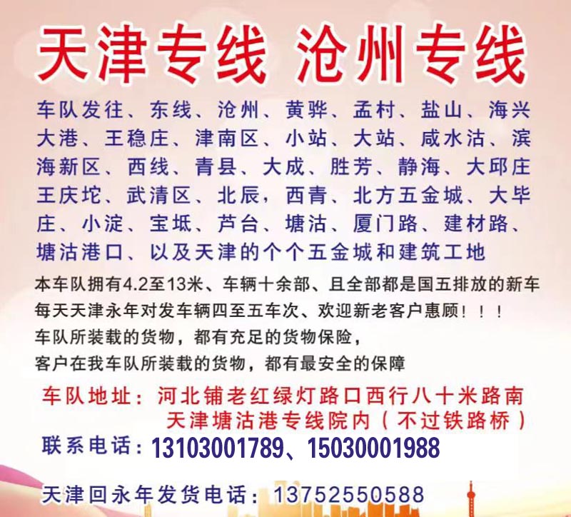 本车队拥有4.2至13米、车辆十余部、且全部都是国五排放的新车,每天天津永年对发车辆四至五车次、欢迎新老客户惠顾!!!