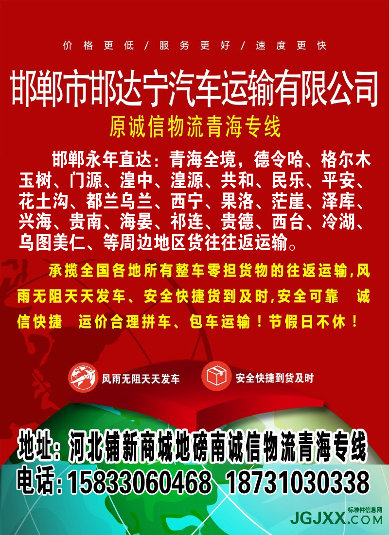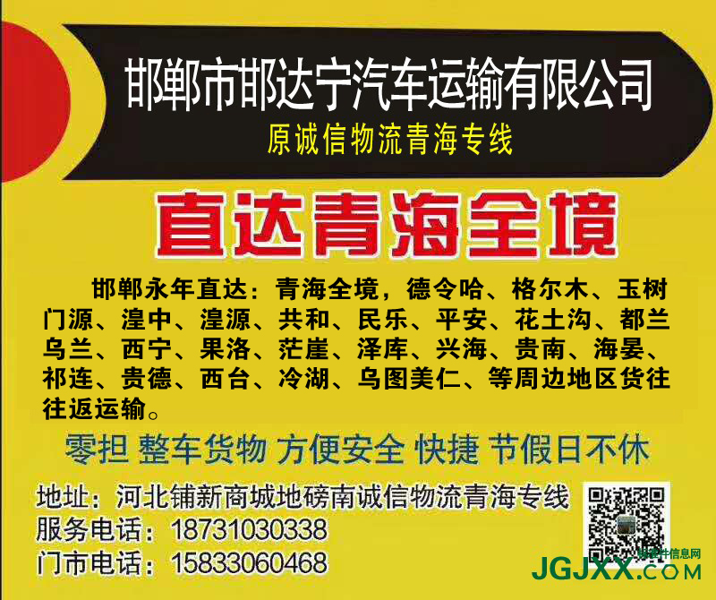 邯郸永年直达:青海全境,德令哈、格尔木、玉树、门源、湟中、湟源、共和、民乐、平安、花土沟、都兰乌兰、西宁、果洛、茫崖、泽库、兴海、贵南、海晏、祁连、贵德、西台、冷湖、乌图美仁、等周边地区货物往返运输;