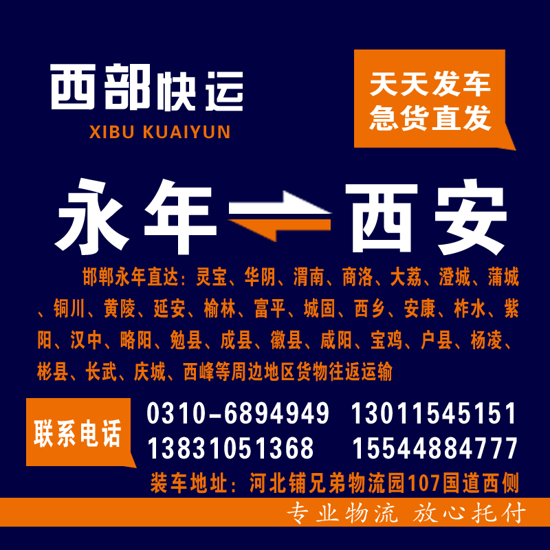 邯郸永年直达:灵宝、华阴、渭南、商洛、大荔、澄城、蒲城、铜川、黄陵、延安、榆林、富平、城固、西乡、安康、柞水、紫阳、汉中、略阳、勉县、成县、徽县、咸阳、宝鸡、户县、杨凌、彬县、长武、庆城、西峰等周边地区货物往返运输