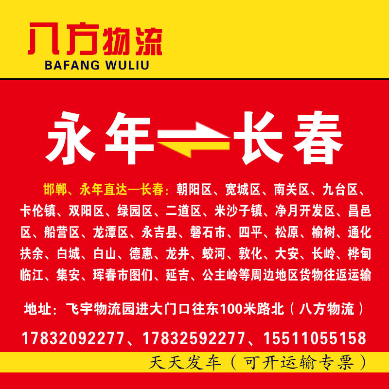 长春:朝阳区、宽城区、南关区、九台区、卡伦镇、双阳区、绿园区、二道区、米沙子镇、净月开发区、昌邑区、船营区、龙潭区、永吉县、磐石市、四平、松原、榆树、通化、扶余、白城、白山、德惠、龙井、蛟河、敦化、大安、长岭、桦甸、临江、集安、珲春市图们、延吉、公主岭等周边地区货物往返运输,覆盖东北三省,点发全国、各大市场均可送货