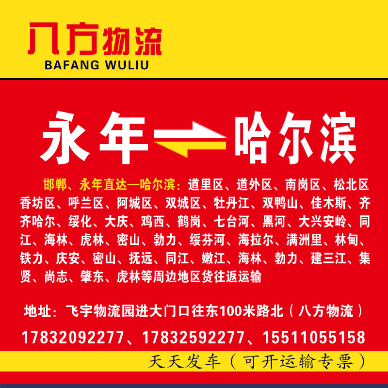 哈尔滨:道里区、道外区、南岗区、松北区、香坊区、呼兰区、阿城区、双城区、牡丹江、双鸭山、佳木斯、齐齐哈尔、绥化、大庆、鸡西、鹤岗、七台河、黑河、大兴安岭、同江、海林、虎林、密山、勃力、绥芬河、海拉尔、满洲里、林甸、铁力、庆安、密山、抚远、同江、嫩江、海林、勃力、建三江、集贤、尚志、肇东、虎林等周边地区货往返运输,覆盖东北三省,点发全国、各大市场均可送货